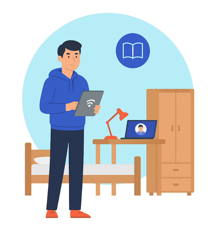 Odalarımızda konforlu yatak, kişisel çalışma masası, geniş dolap ve kesintisiz internet standart olarak sunulmaktadır.